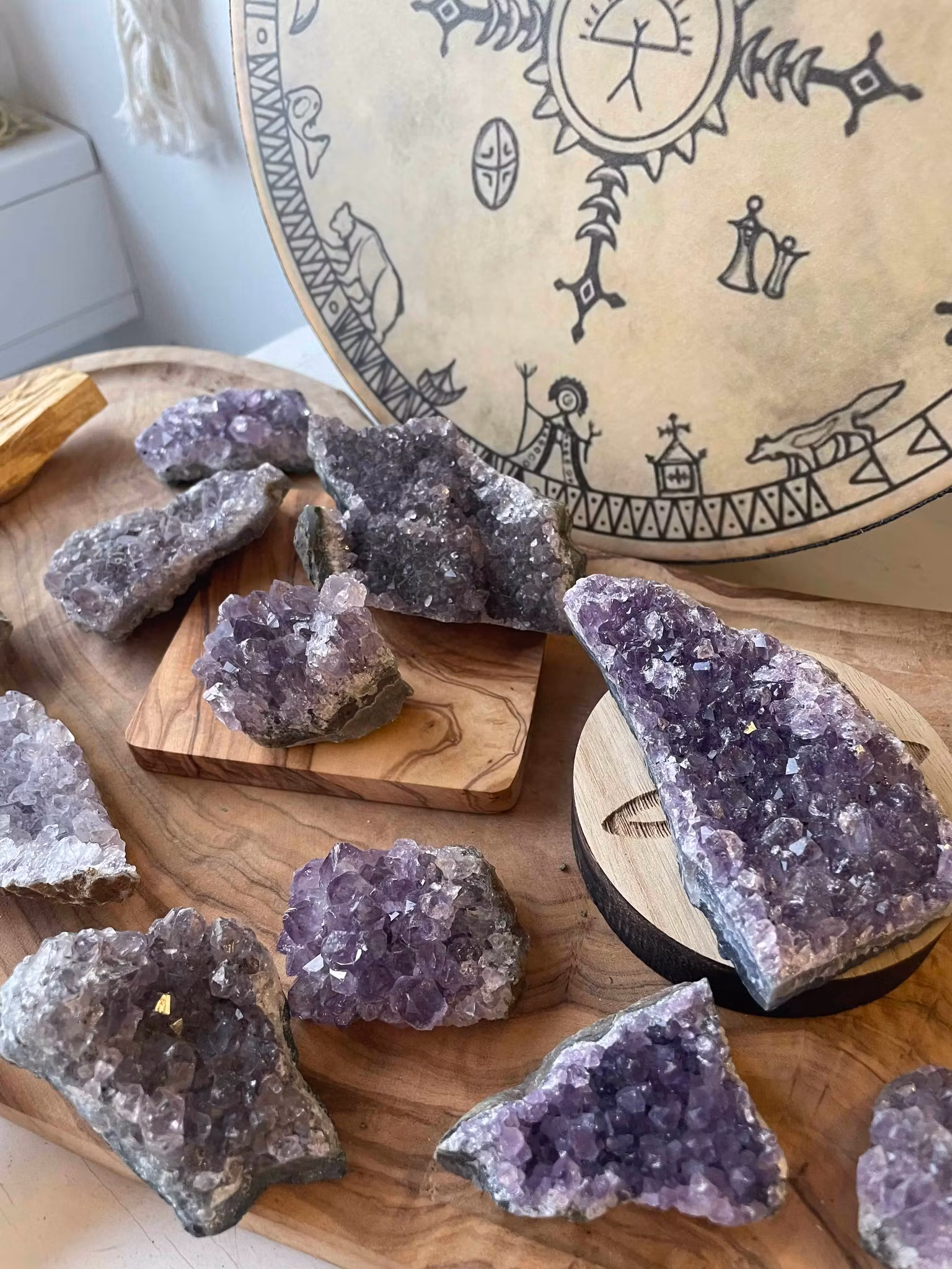 Varierar i storlek och form men väldigt fina och hög kvalitet. Dessa är extra mörka i färgerna och riktigt fina. Ametist är en fantastisk sten om du vill ha hjälp med att släppa negativa tankar, lugna sinnet och få hjälp med att dämpa oro och ångest. Säljs styckvis