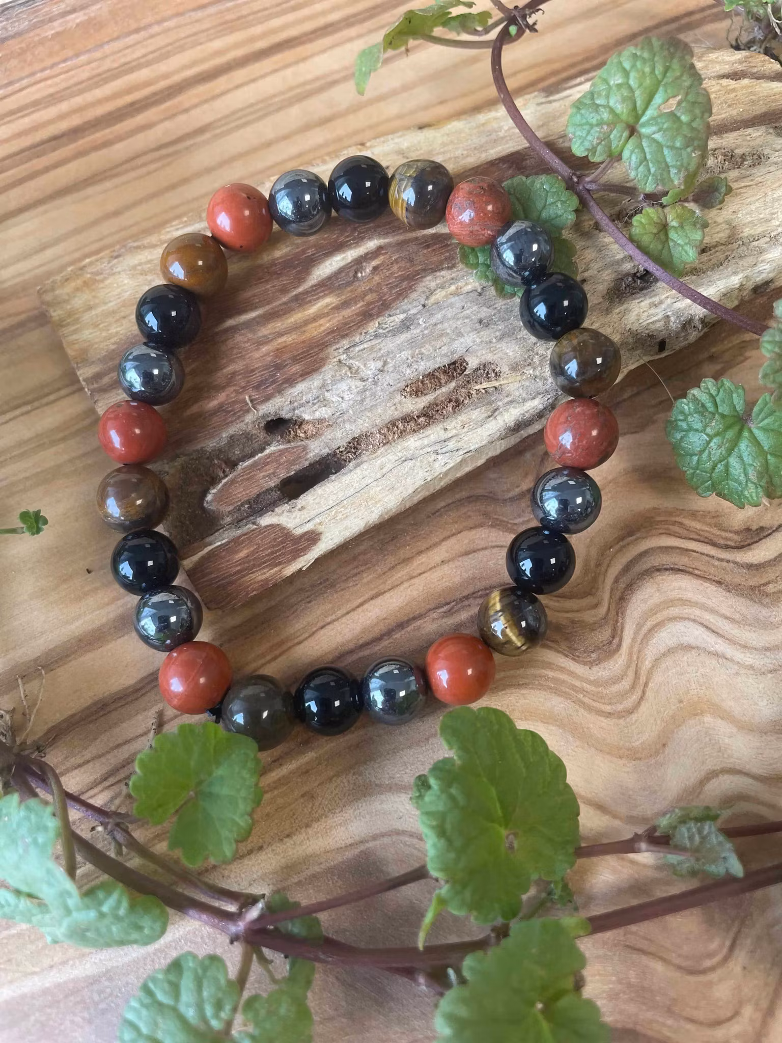 Kombinations armband för beskydd, detta är ett kraftfullt och starkt armband med tre olika kristaller. Armbanden är handgjorda. Pärlorna är helt naturliga och 8mm stora. Armbandet har fyra olika kristaller och fungerar nästan som en sköld medan den hjälper dig att självläka.Svart Onyx: Den ger stöd i svåra situationer och under perioder med mycket stress. Den hjälper till att centrera din energi. Onyx är också bra för personer med koncentrationssvårigheter och hjälper dig att fokusera. Den beskyddar dig när du behöver extra styrka och känner dig svag,Tiger öga: har skyddande egenskaper. Den är tänkt att skapa en sköld mot negativa energier och främja mental klarhet. För också tur och välgång till sin bärare. Hematit:Hematit är en starkt beskyddande kristall, den är också väldigt grundande och jordande och är bra att använda om man behöver balansera upp bas chakrat. Den löser upp negativa energier och hindrar nya negativa energier att tränga in i din aura. Den stärker självkänslan.Röd Jaspis hjälper dig att starta igång läkningsprocesser i kroppen och skydda dig mot andras illvilja.