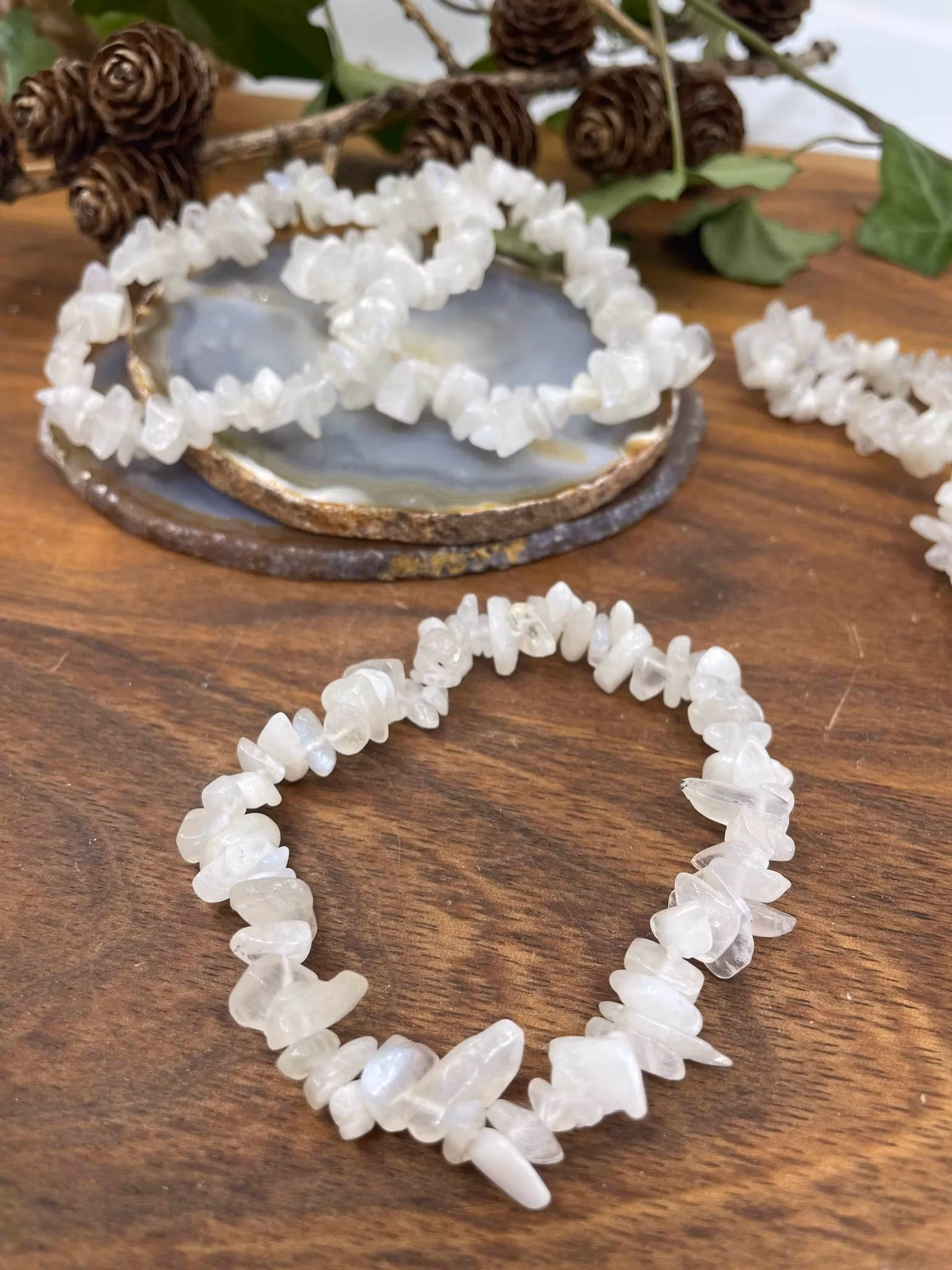 Stretch armband av naturliga ädelstenar, 55 mm. Månstenen har en tryggande och beskyddande energi. Renhet och ljus är egenskaper som månstenen har. Den har också kvinnlig energi och kan hjälpa till vid menssmärtor.