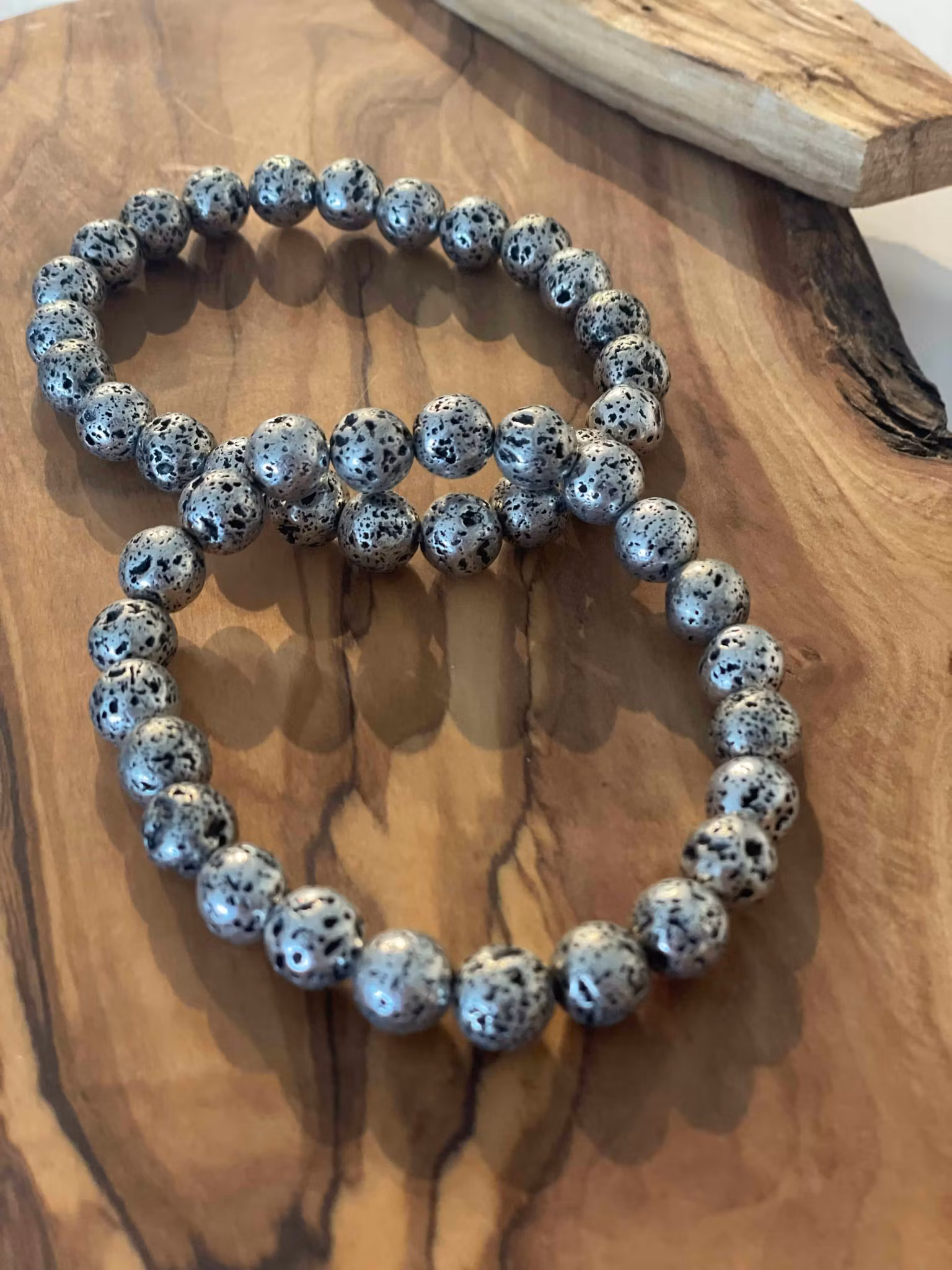 Armband med naturlig lavasten med en silverplätering, silver stärker lavastenens egenskaper. Den har lugnande och harmoniska energier och är väldigt fin att ha på sig om man lätt får panik känslor. Säljs styckvis. Pärlorna är 8mm stora.