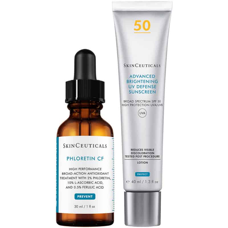 1. Serum – SkinCeuticals Phloretin CF (30ml) SkinCeuticals Phloretin CF representerar en ny kategori inom den förebyggande och korrigerande antioxidantvården. För att motverka de fria radikalernas negativa påverkan på huden har SkinCeuticals efter fem års omfattande forskning utvecklat denna patentsökta, banbrytande formula, som kombinerar phloretin med C-vitamin och ferulinsyra. Serumet hjälper till att reducera pigmentförändringar för en jämnare och mer strålande hudton. Phloretin CF är en bredspektrumsbehandling, som stärker huden och skyddar mot fria radikaler. Resultatet är en hud som ser fastare och ungdomligare ut. Förebygger tidiga ålderstecken och reducerar pigmentering Reducerar utvecklingen av reaktiva oxygenförbindelser i huden (ROS) Skyddar mot förändringar i huden Främjar cellförnyelse för att skapa en mer strålande och jämn hud Stärker huden Idealisk för normal, fet och kombinerad hud 2. Solskydd – SkinCeuticals Advanced Brightening Defense SPF50 (40 ml) Advanced Brightening UV Defense SPF50 är ett bredspektrigt UV-skydd som hjälper till att motverka pigmenteringar. Den har en lättviktig formula som bland annat innehåller 1% tranexamsyra och 2% niacinamid som hjälper till att jämna ut hudtonen och minimera synligheten av pigmenteringar. Appliceras varje morgon för att skydda huden mot UV-strålar.
