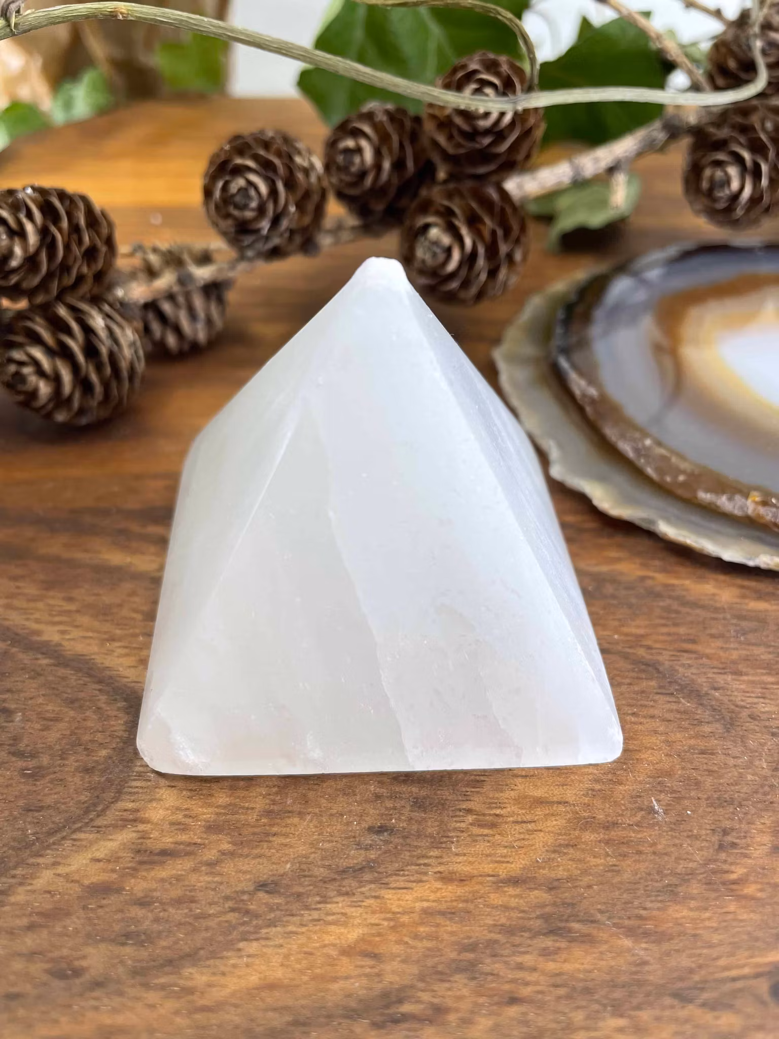 Det är allmänt accepterat att selenit är en av de mest kraftfulla kristallerna för helande. Den ansluter också till det tredje ögat, kronan och eterchakran. Vissa säger att det främjar renhet och ärlighet. Det sägs att det tvingar personen som håller den att vara ärlig mot sig själv. Selenitpyramidens storlek: Höjd 5 cm, bredd 4,5 cm. Från Marocko.