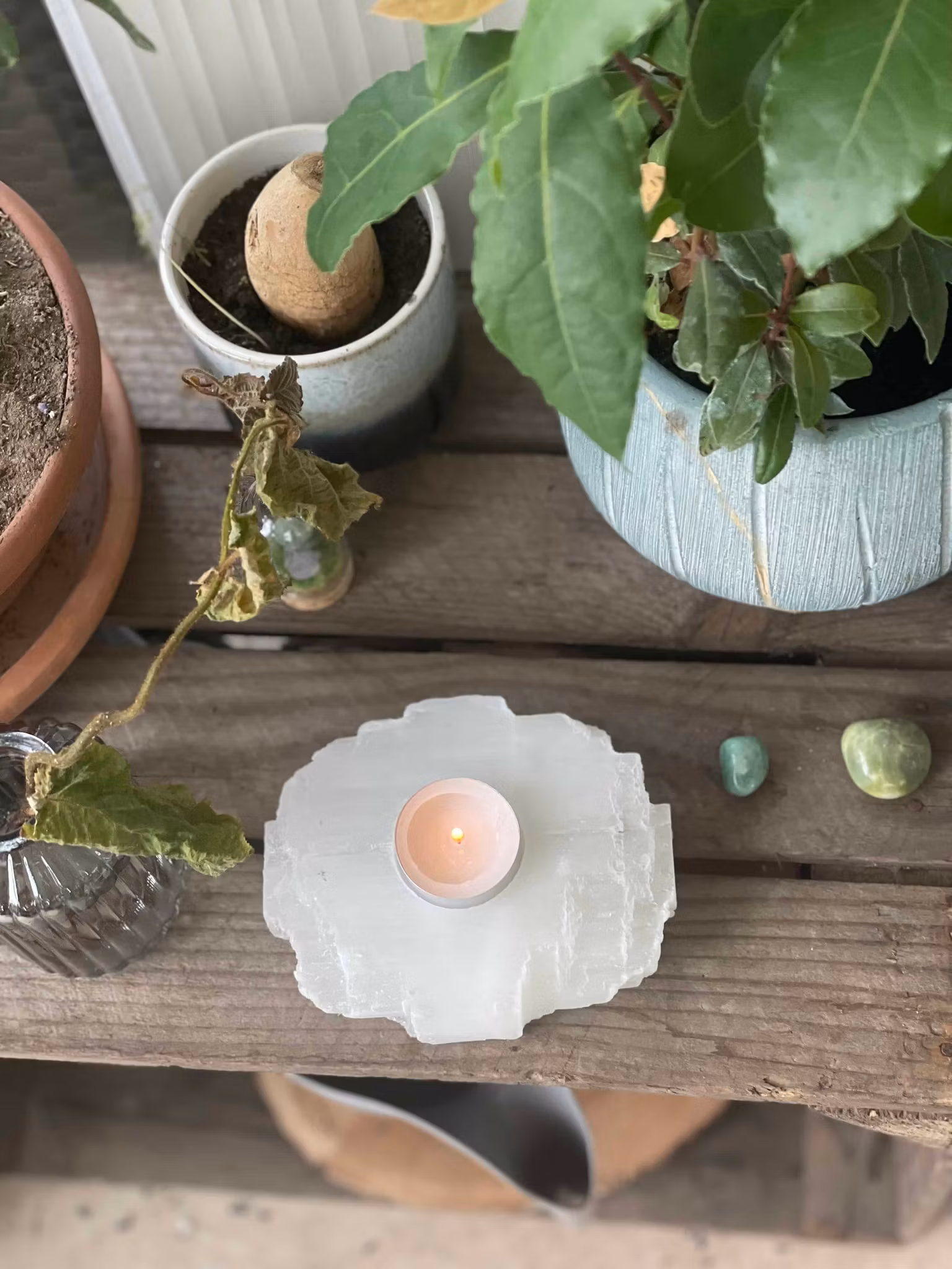 Vacker och stor värmeljushållare i Selenit. Ljusstaken väger ca 700 gram.Selenit står för mildhet, godhet och det inre gudomliga rena ljuset.Storlek på ljushållaren är: 13x4cm.