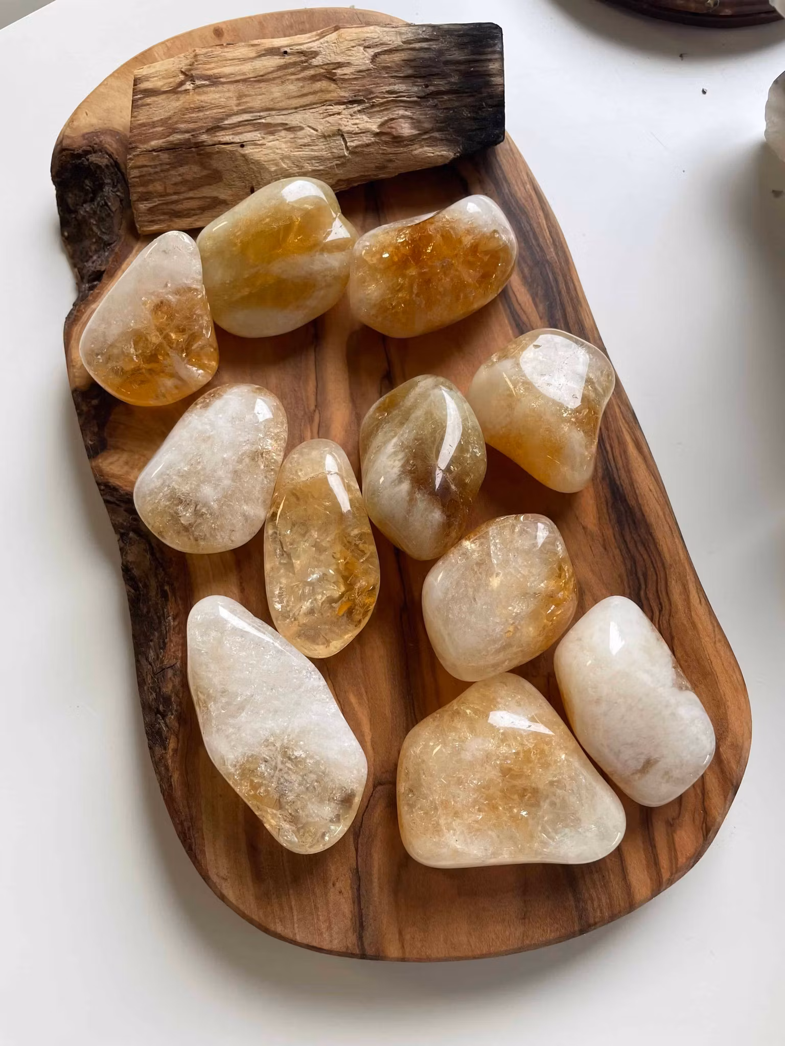 Trumlad äkta citrin kristaller, 4-6cm. Kristallerna kommer i Brasilien. Säljs styckvis.Naturlig citrin är ganska sällsynt. Citrin sägs vara solens strålar och är starkt energi givande, den kan också kallas lyckosten då den för med sig positiva känslor och tankar. Citrin är bra att bära med sig i skolan eller på jobbet då den hjälper dig att hålla energinivån uppe.Bra kristall att bära med sig om man kämpar mot fobier, rädslor och depression.