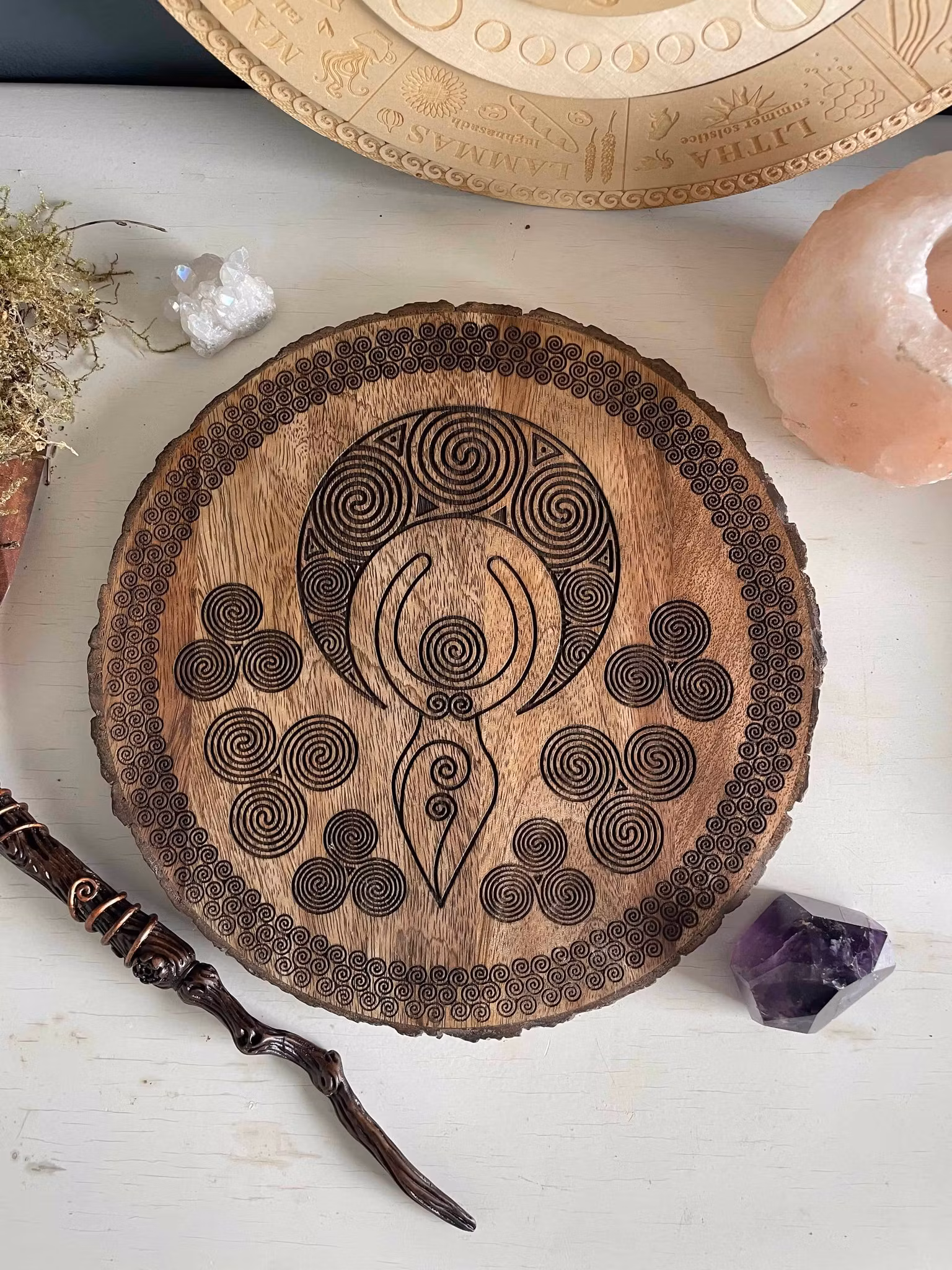 Träbricka med graverat mönster av triskile och mångudinnan. Perfekt att använda på sitt altare eller till kristaller, och ritualer. Storlek: 25cm i diameter.
